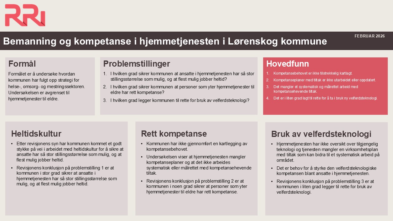 Undersøkelsen viser at kommunen mangler oversikt over tilgjengelige velferdsteknologiske hjelpemidler og tiltak for å ta i bruk nye hjelpemidler. Videre er det behov for å styrke den velferdsteknologiske kompetansen blant ansatte i hjemmetjenesten. Det tilbys enkelte kurs om bruk av velferdsteknologiske hjelpemidler, men dette gjelder stort sett hjelpemidler som allerede er tatt i bruk, som for eksempel medisindispensere.